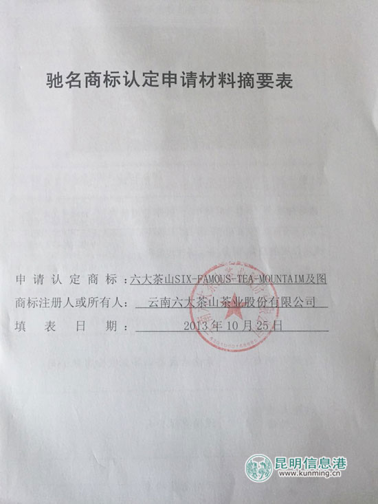 昆明信息港讯 记者日前获悉,云南六大茶山茶业股份有限公司的“六大茶山及图”商标被认定为中国驰名商标。成为我省仅有的10个获此殊荣的茶企商标之一。